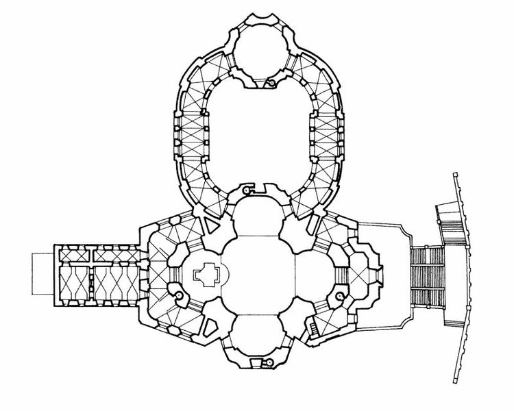Důležitou roli v osnově půdorysu, která je určena geometrickými vztahy základního kružnicového schématu, hrají opsané a vepsané pentagony, které mohou odkazovat k pěti ranám Kristovým stejně jako k symbolu univerzality. Symboliku pětice doplňuje rovněž význam dalších čísel (3, 4 a 12). V jinak ryze barokní stavbě se nacházejí některé také latentní gotismy. Jde především o hustě skládané lineární profily říms, trojlisté záklenky oken a vnitřní ochozy chrámu, které navazují na typ středověkých ochozových centrál. Tvarosloví interiéru i exteriéru vychází z kompozitního řádu. V exteriéru jsou skladebné poměry pilastrů i utváření jejich detailů volnější než v interiéru chrámu. Tu jsou pilířové úseky stěn osazeny pilastrovými srostlicemi kompozitního řádu, nasazenými na vysokém soklu a vynášejícími kladí. „Podstatnou součástí utváření stěny je i bohatá škála arkádových a okenních otvorů, které otevírají plochy polí a utvářejí onen podivuhodný světelně transparentní charakter zdi. Na osy otvorů navazují i velká, výškově oválná okna, probírající paty kleneb. Působení dosedu klenby na korunu stěn je tím výrazně vylehčeno. Klenební plochy působí spíše jako vzhůru se vzdouvající než dosedající a tlačící směrem dolů. Kumulace světla v horní části prostoru rovněž toto optické vylehčení až odhmotnění stěn a kleneb podporuje.“ Skvěle zvládnutá je i krajině urbanistická situace areálu.